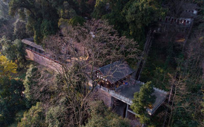 After the Golden Age of Qing Dynasty, the country started to weaken. This also had an effect on accelerating the decline of Taoism, and He Ming Mountain Taoist Temple ended up becoming more of a summer resort. Before the Cultural Revolution in 1966, He Ming Mountain still had some well-maintained old architectural structures such as pavilions, platforms, altars, roofed and roofless gates. At that time, there were still a number of temples, namely San Guan Temple (三官祠), Wen Chang Temple (文昌宫), Tian Shi Temple, Shang Qing Temple, Yan Xiang Temple, Ying Xian Reception Hall, Shen Xian Temple, Zi Yang Temple and Yu Huang Temple. However, most of these structures were destroyed during the 1966 Revolution. Since 1987, as China has restarted its reform and opening-up of the economic markets, He Ming Mountain Taoist Temple has also resumed its reconstruction. Today, one can find a cluster of buildings which include Ying Xian Reception Hall, Dou Mu Temple (斗姆殿), Ci Hang Temple (慈航殿), Wu Zu Temple (五祖殿), San Sheng Temple (三圣宫), Tian Shi Temple, Yu Huang Temple (玉皇殿), Qing Xin Tea Room (清心茶园), Shuang He Dormitory (双鹤楼), Qian Dao Dormitory (乾道楼), Kun Dao Dormitory (坤道楼), administrative buildings and offices.